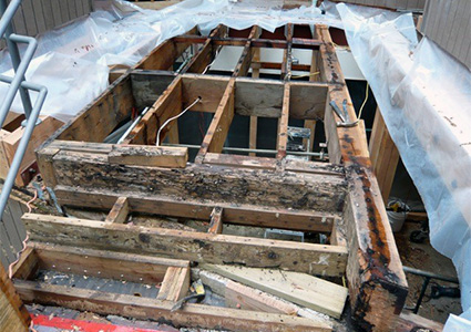 Damp conditions under courtyard pavers also created structural dry rot damage.